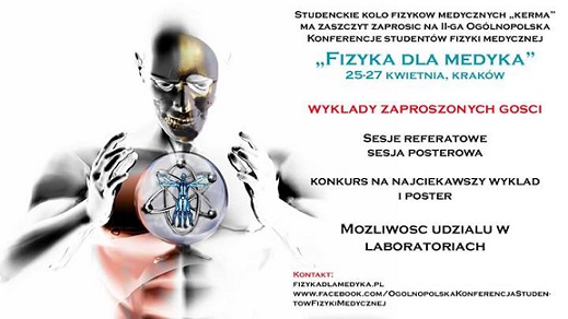 Studenckie Koło Fizyków Medycznych „KERMA” ma zaszczyt zaprosić na II-gą Ogólnopolską Konferencję Studentów Fizyki Medycznej „Fizyka dla medyka”, która odbędzie się pod patronatem dwumiesięcznika Inżynier i Fizyk Medyczny w Krakowie w dniach 25-27 kwietnia 2014 roku. W konferencji przewidziano sesje referatowe i sesję posterową oraz możliwość udziału w ciekawych laboratoriach. Uczestnicząc w konferencji będą mieli Państwo możliwość wysłuchania niezwykle interesujących wykładów…