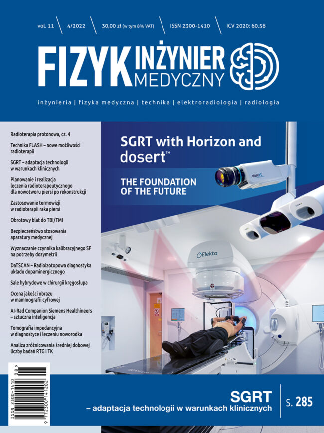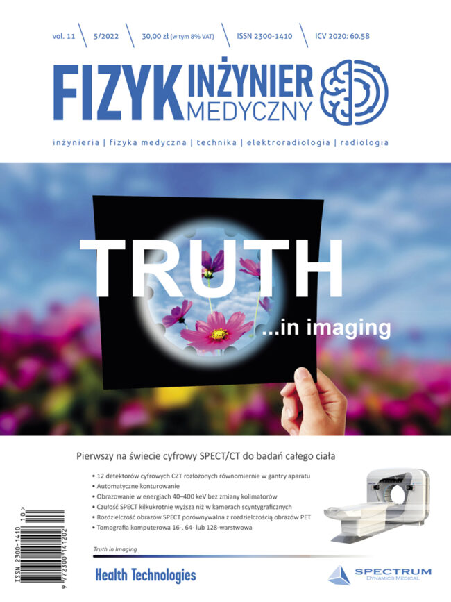 PEŁNE WYDANIE: https://sklep.inzynier-medyczny.pl/ spis treści Sympozjum Naukowo-Szkoleniowe – RWS 2022 Zarządzanie kadrą specjalistów w dziedzinie inżynierii klinicznej Podyplomowe szkolenie fizyków medycznych – i co dalej? Rola fizyka medycznego w procesie weryfikacji obrazowej pacjentów w trakcie radioterapii Radioterapia protonowa, cz. 5: Pozycjonowanie pacjenta w radioterapii protonowej nowotworów zlokalizowanych poza narządem wzroku Tomografia spektralna Pomiar mechanicznego…